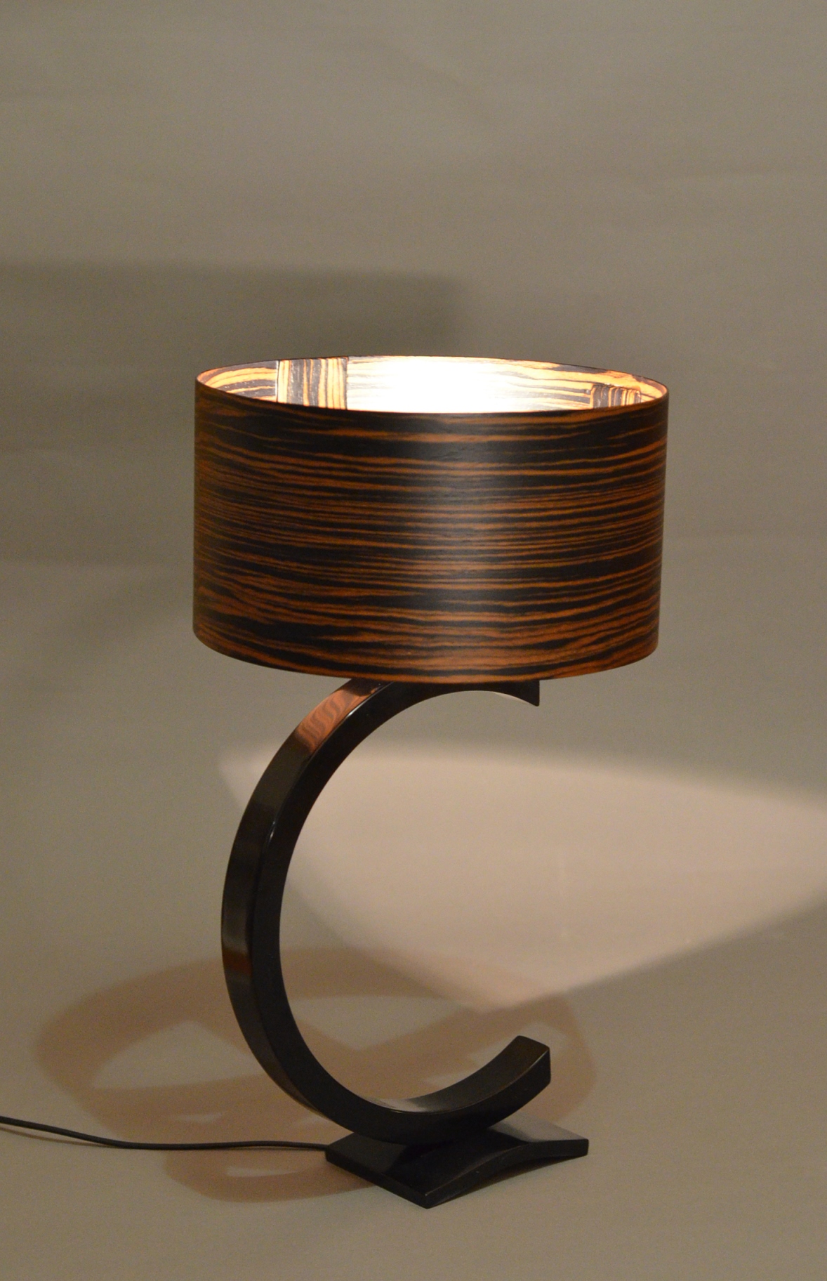 Επιτραπέζιο φωτιστικό υψηλής αισθητικής και ποιότητας απο Staron solid surface σε απόχρωση Black Metallic Galaxy με καπέλο από καρυδιά, δρυς ή εβενος, κατάλληλο για το σαλόνι, το χωλ ή το υπνοδωμάτιο.