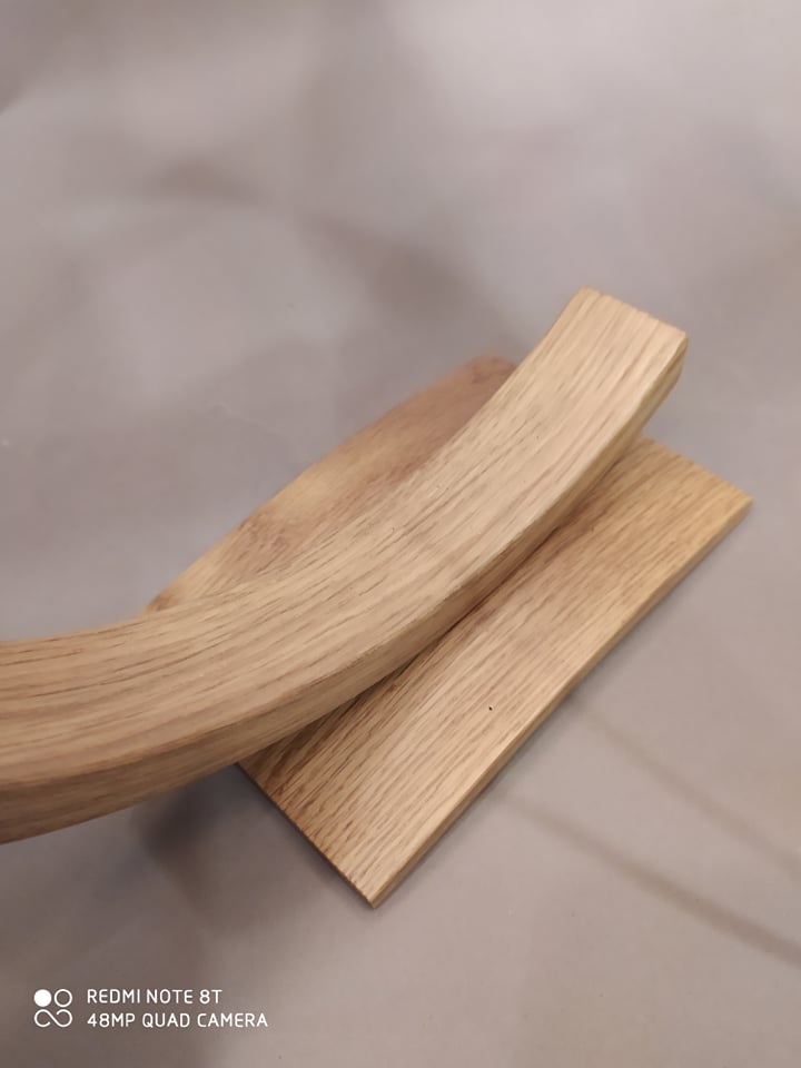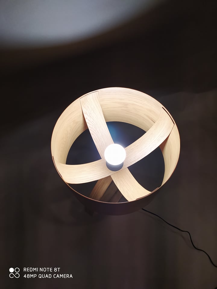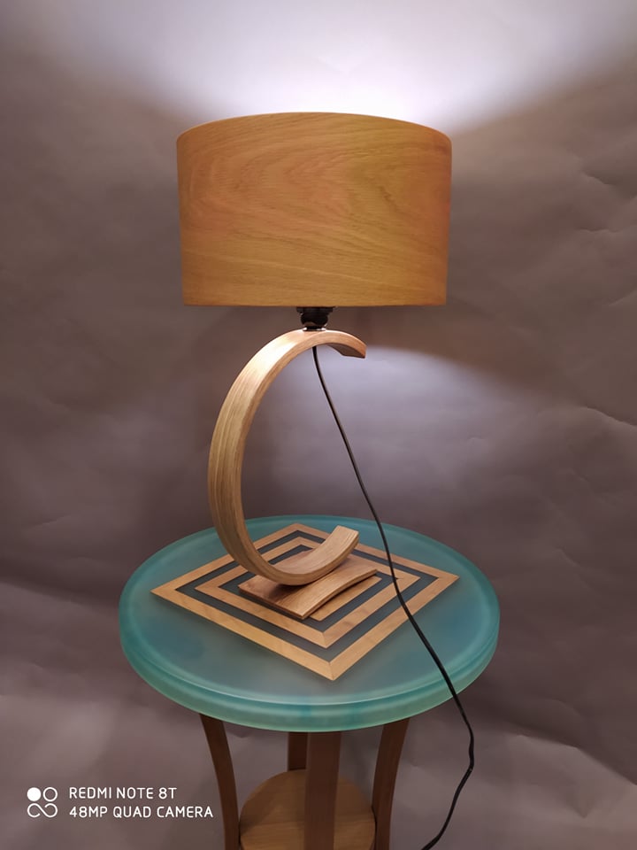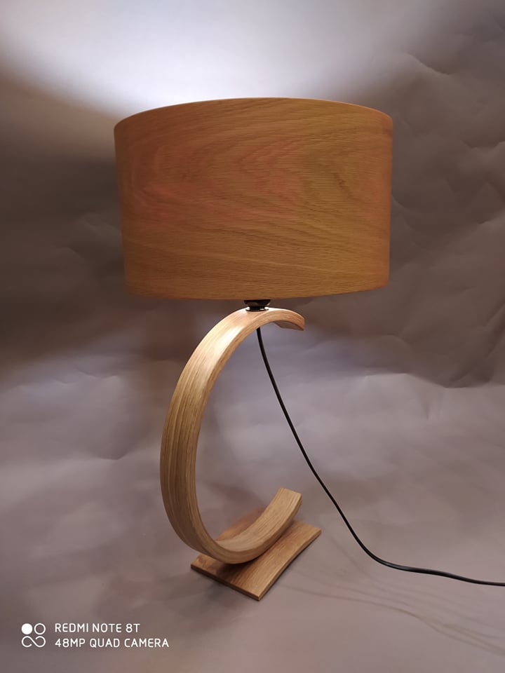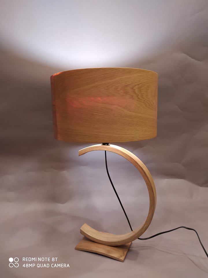 Επιτραπέζιο φωτιστικό υψηλής αισθητικής και ποιότητας με σώμα από δρυς και καπέλο επίσης από δρυς, κατάλληλο για το σαλόνι, το χωλ ή το υπνοδωμάτιο.