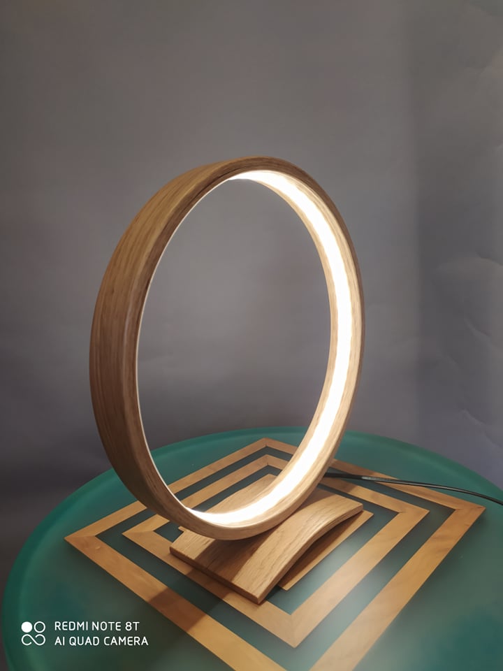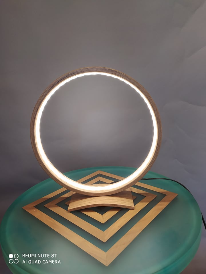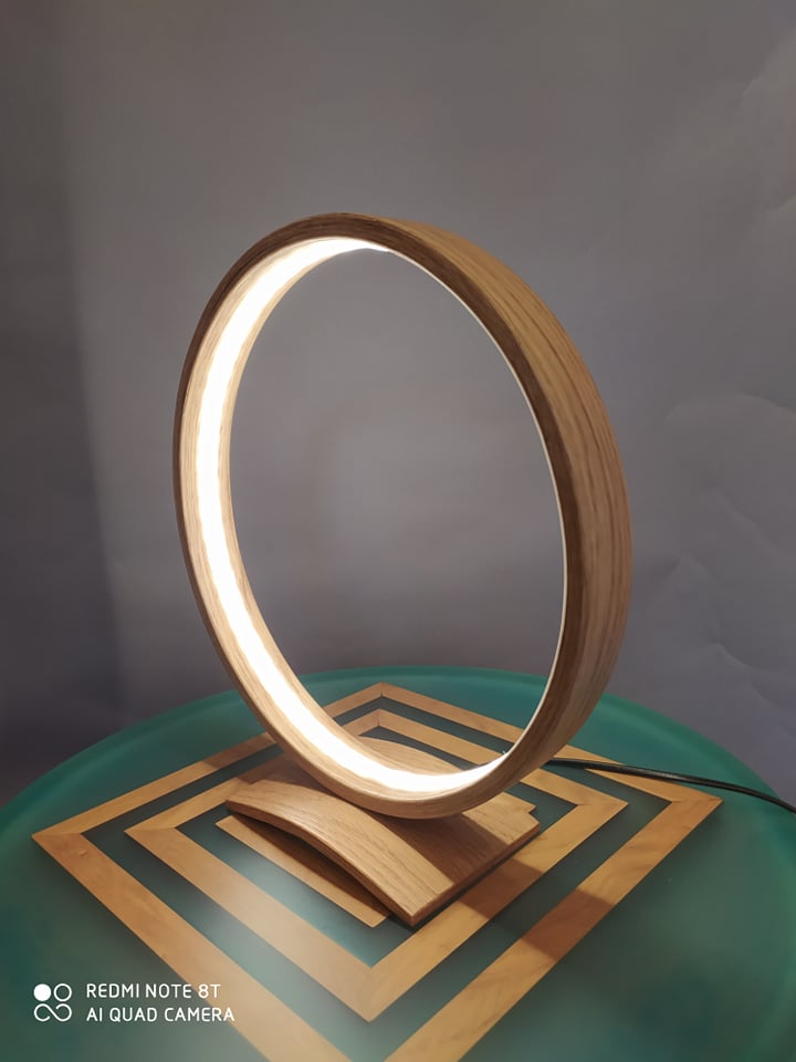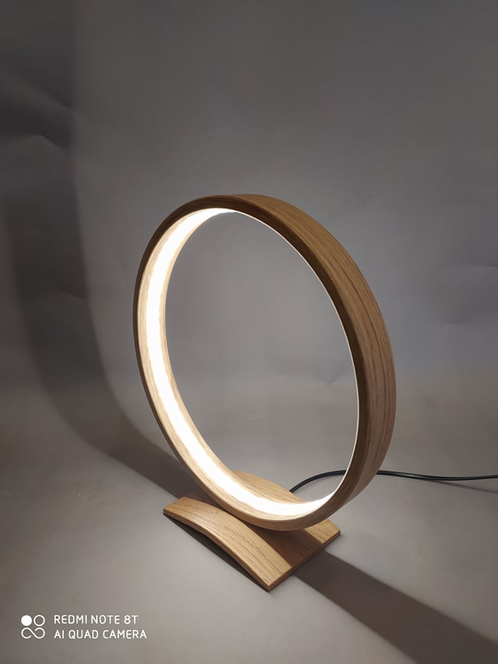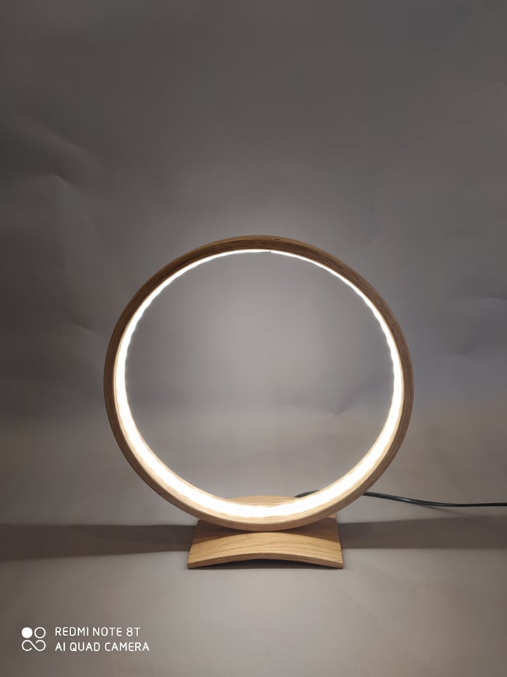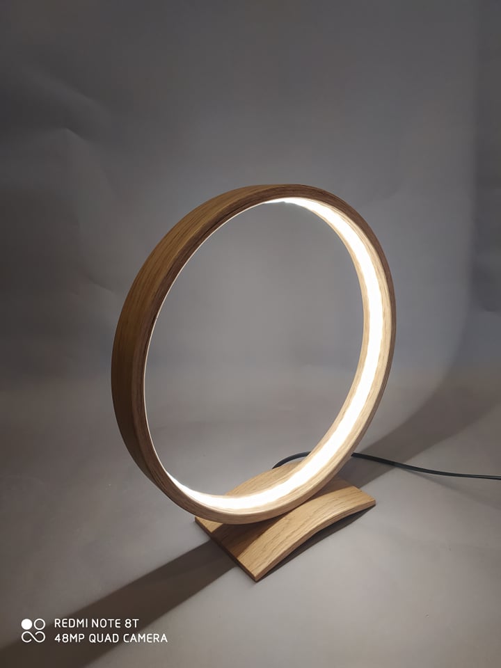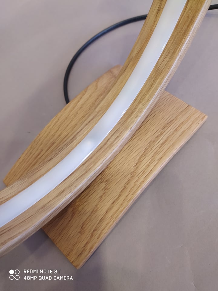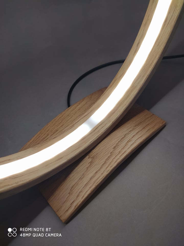 Επιτραπέζιο φωτιστικό υψηλής αισθητικής και ποιότητας από μασίφ δρυς σε φυσική απόχρωση με ταινία led 4.8 watt σε όλο το μήκος του. Διαστάσεις: 33cm x 35cm