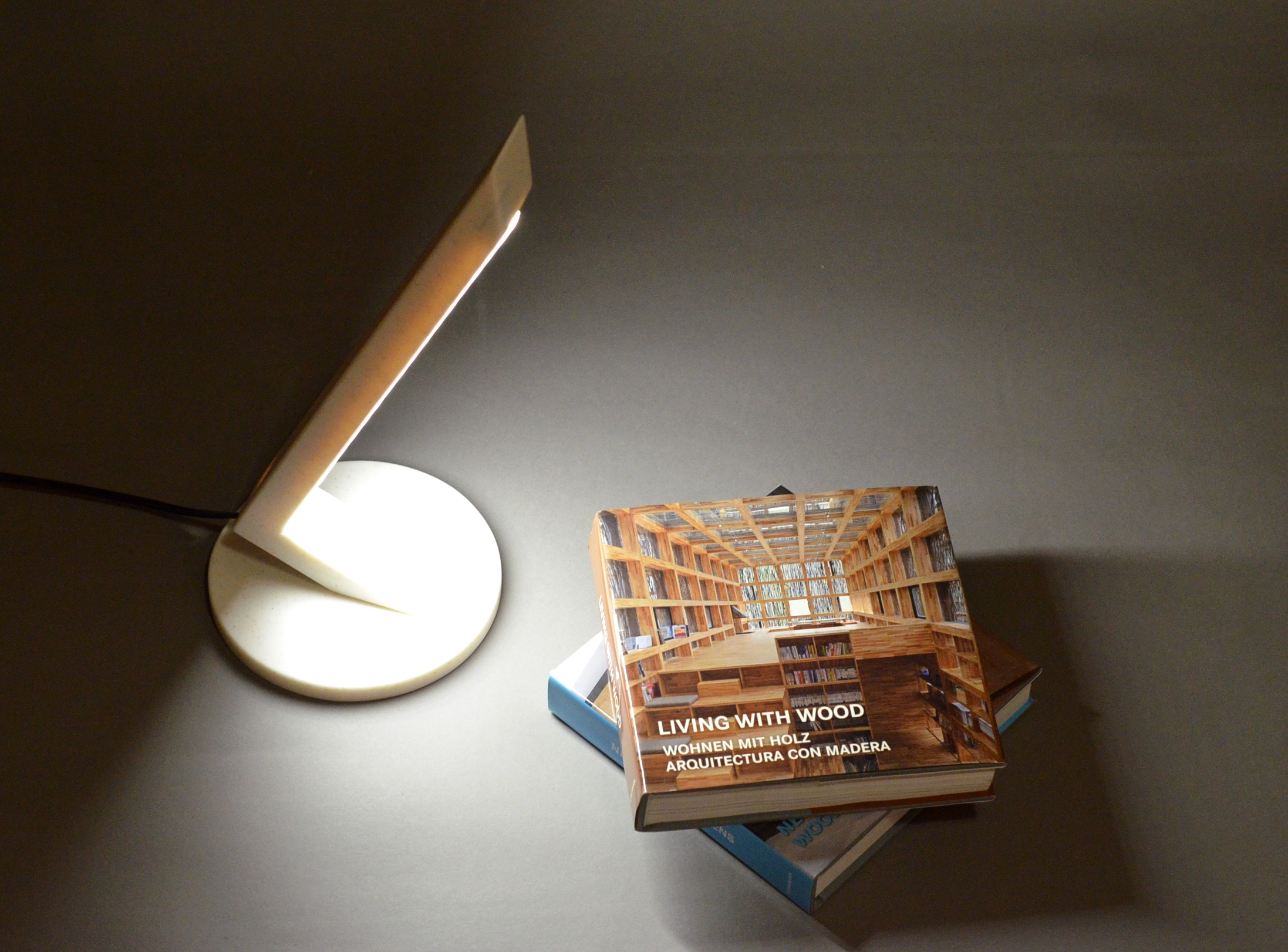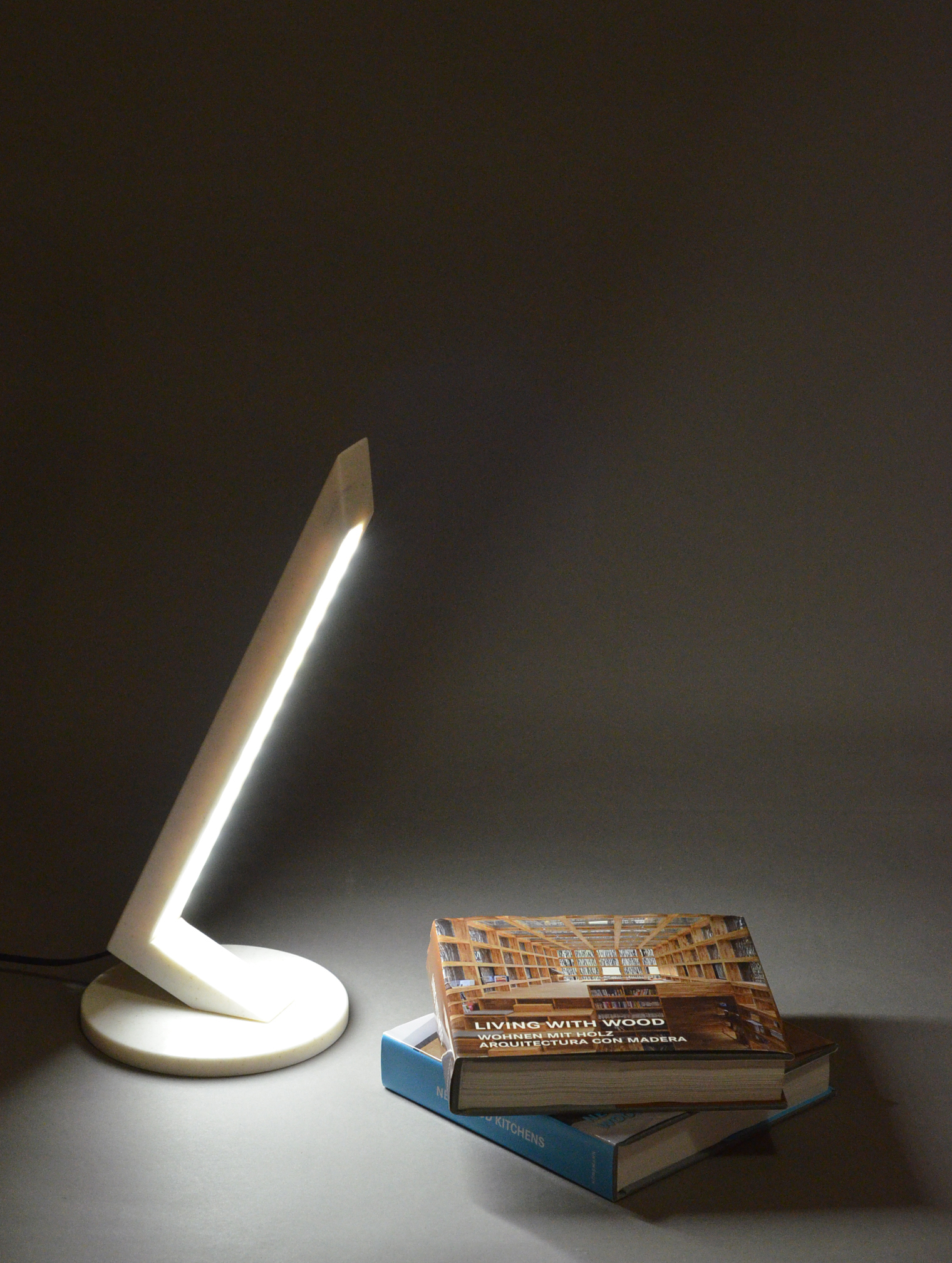 Επιτραπέζιο φωτιστικό minimal αισθητικής και γραμμικής σχεδίασης, κατάλληλο για το γραφείο ή το κομοδίνο, κατασκευασμένο από Franke Solid Surface σε απόχρωση Cinnamon Beige με ταινία led 4.8 watt warm white.