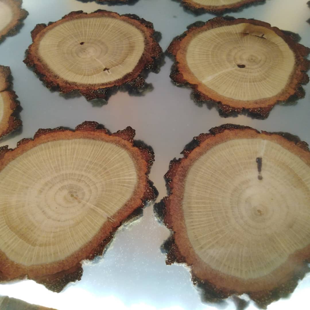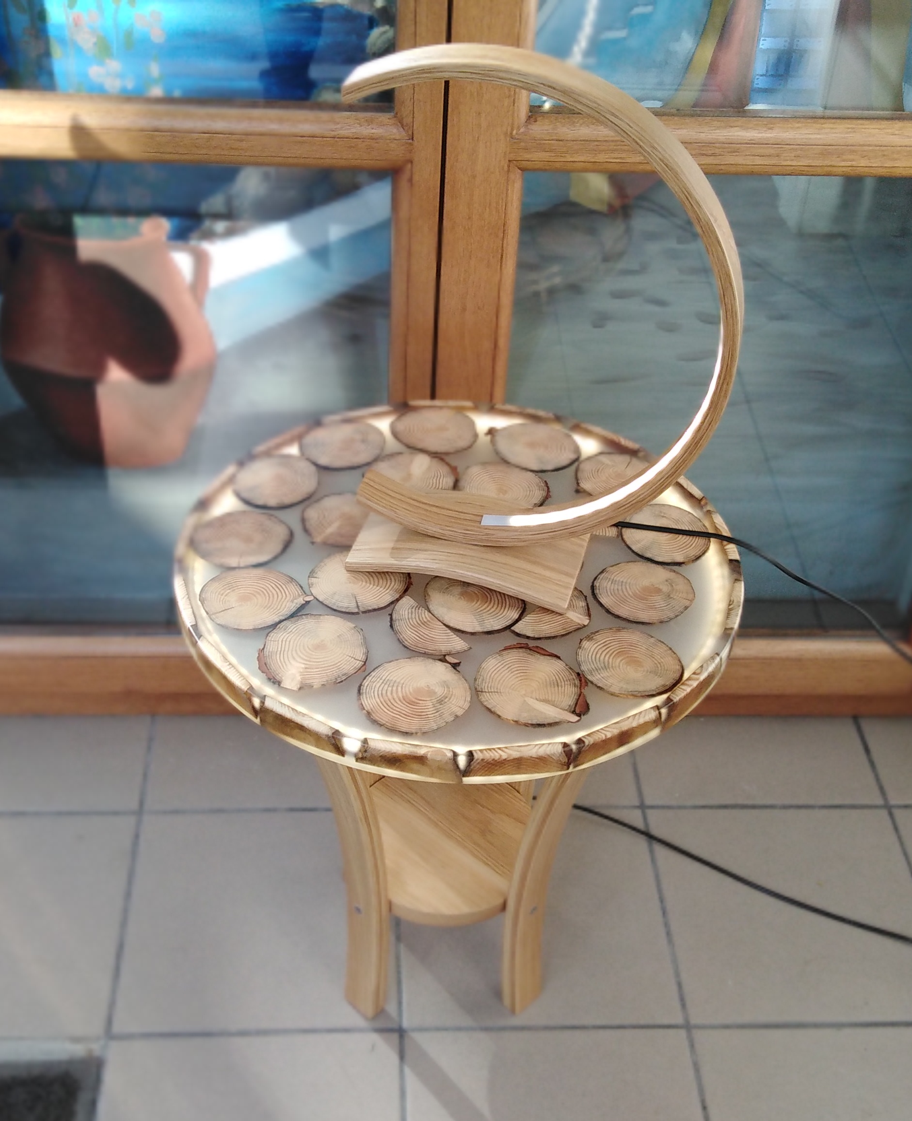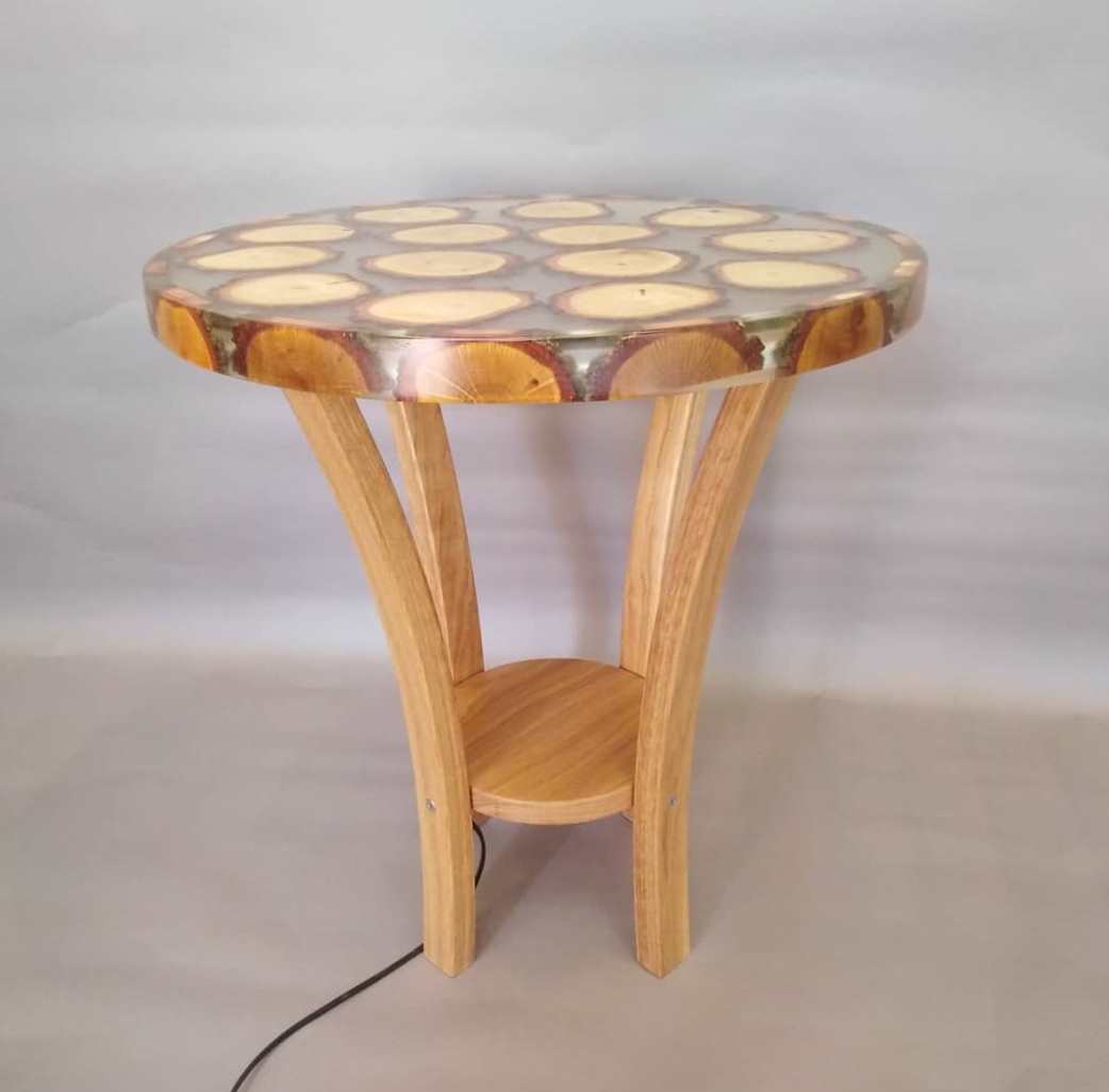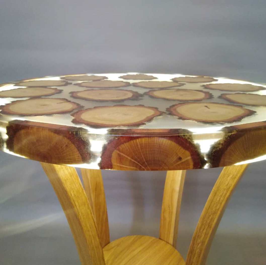 Τραπεζάκι από μασίφ δρυ, με κορμούς φυτεμένους σε εποξική ρητίνη και κρυφό φωτισμό.