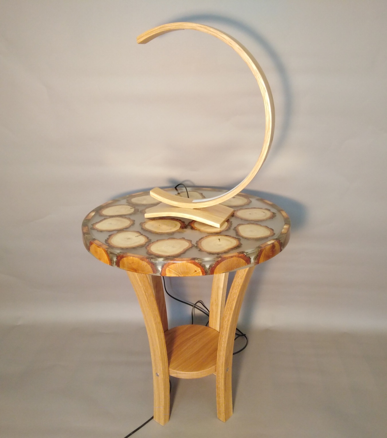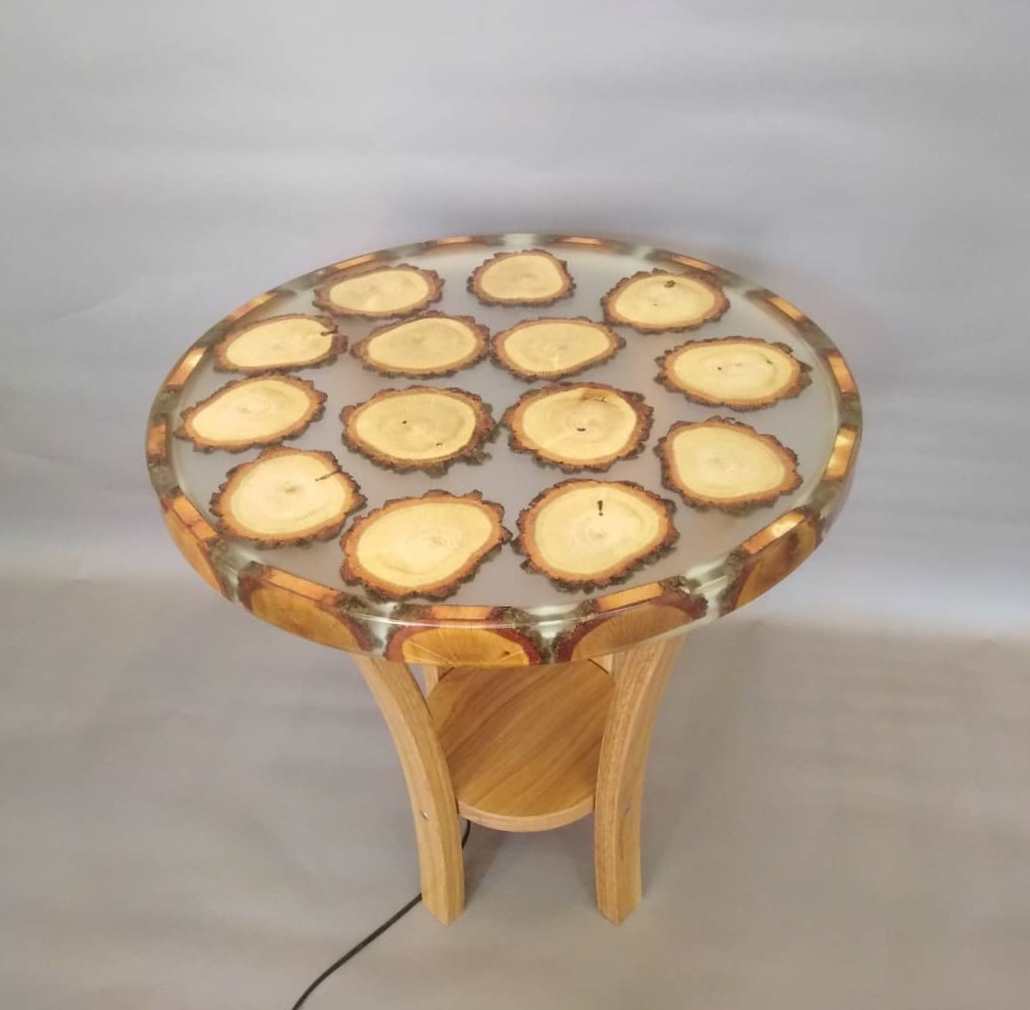 Βοηθητικό τραπεζάκι από μασίφ δρυ, με κορμούς φυτεμένους σε εποξική ρητίνη και κρυφό φωτισμό από ταινία led.